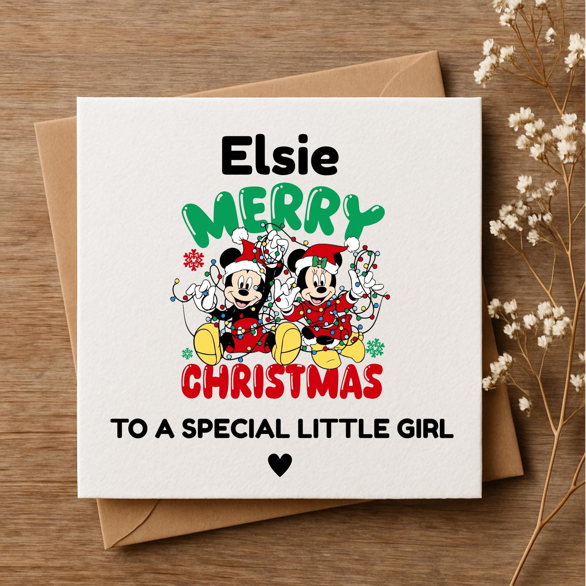 Personalised Disney Inspired Christmas Card • Custom Name Kids Xmas Card • Mickey Minnie Style • 5x5 6x6 5x7 Card • Special Little Girl