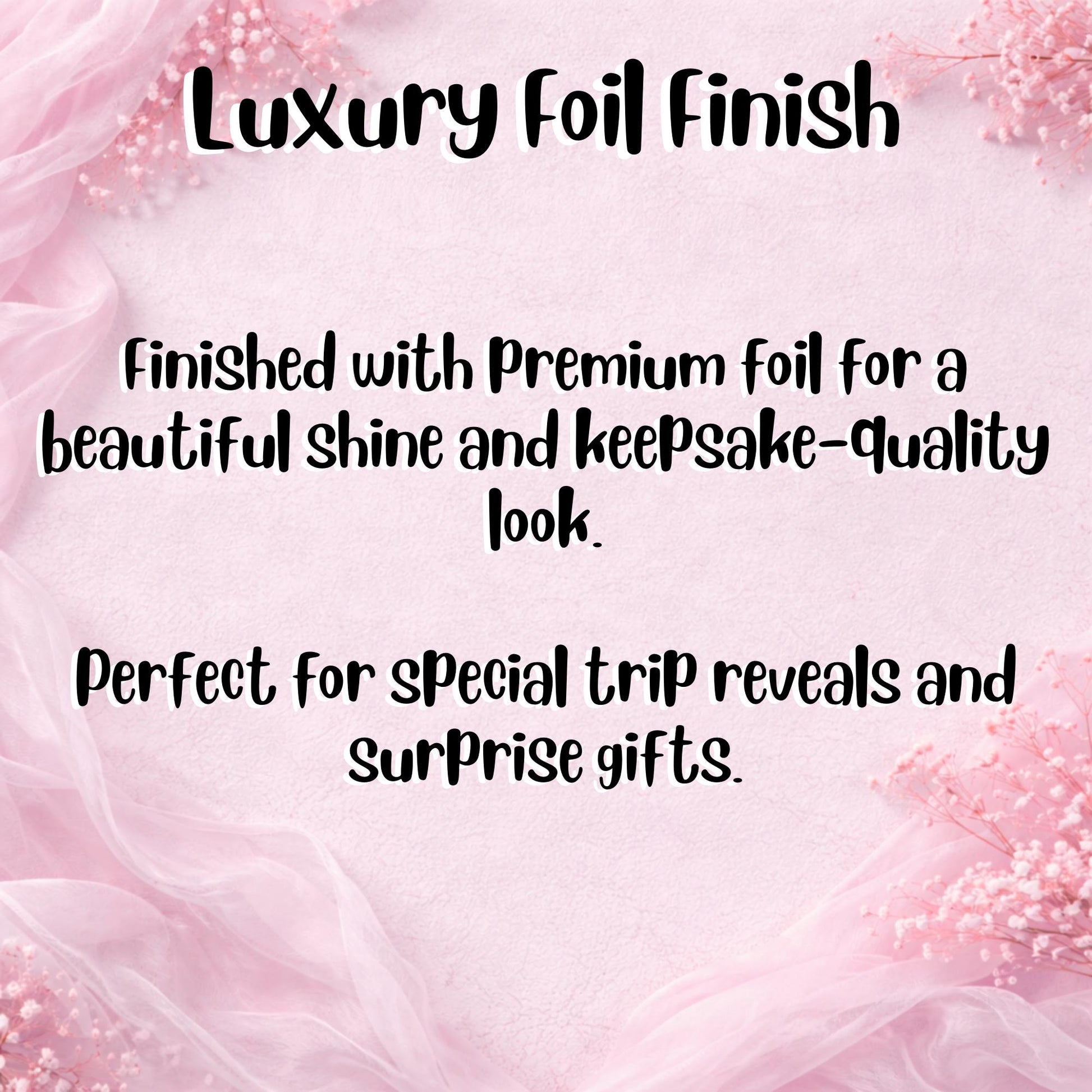 Surprise your loved ones with a magical reveal! Our Disney-inspired custom foil tickets are perfect for any occasion — from birthdays and holidays to dream vacations and surprise trips. Each ticket is designed to look like a sparkling, golden boarding pass to magic and wonder, tailored to your exact message, date, and name.
