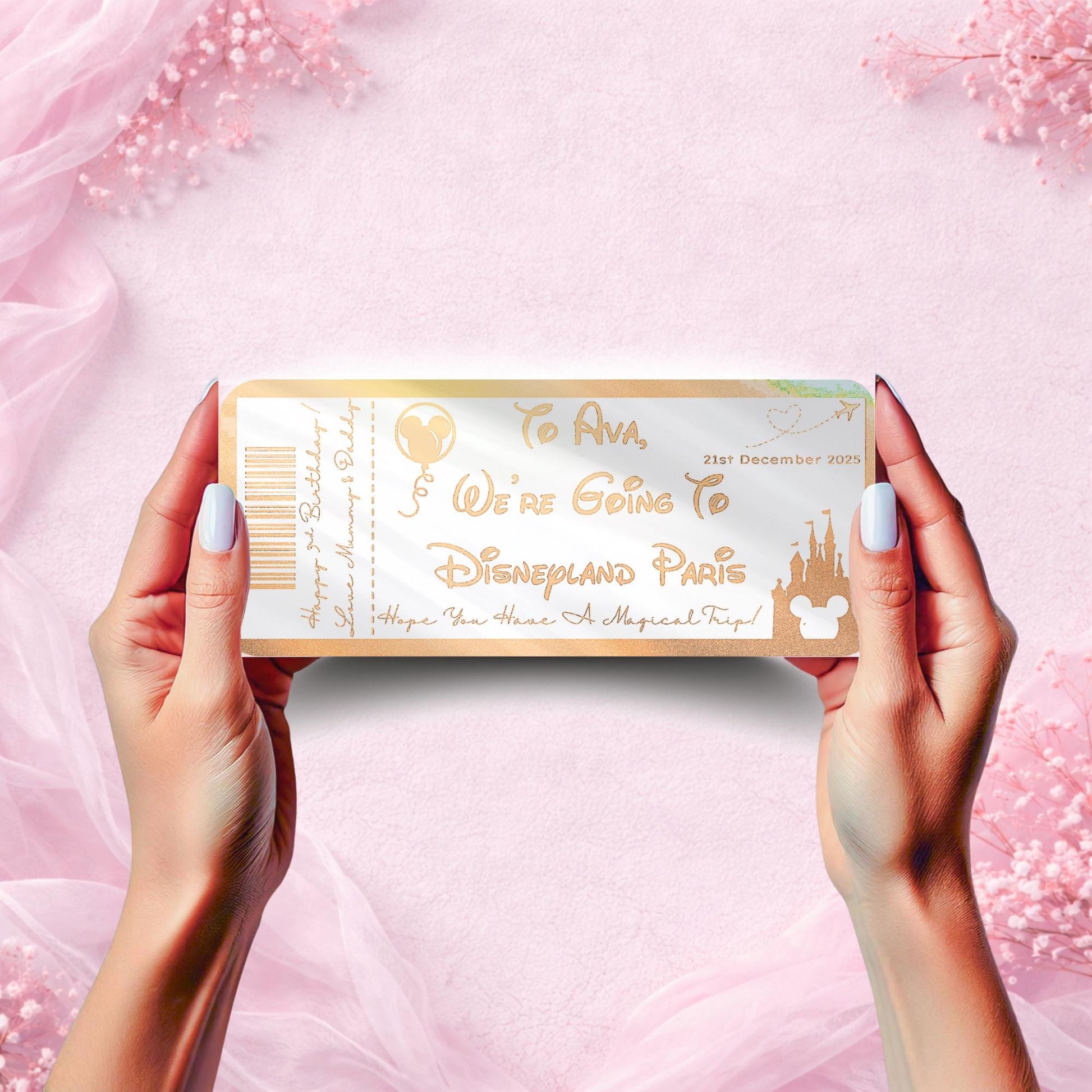 Surprise your loved ones with a magical reveal! Our Disney-inspired custom foil tickets are perfect for any occasion — from birthdays and holidays to dream vacations and surprise trips. Each ticket is designed to look like a sparkling, golden boarding pass to magic and wonder, tailored to your exact message, date, and name.