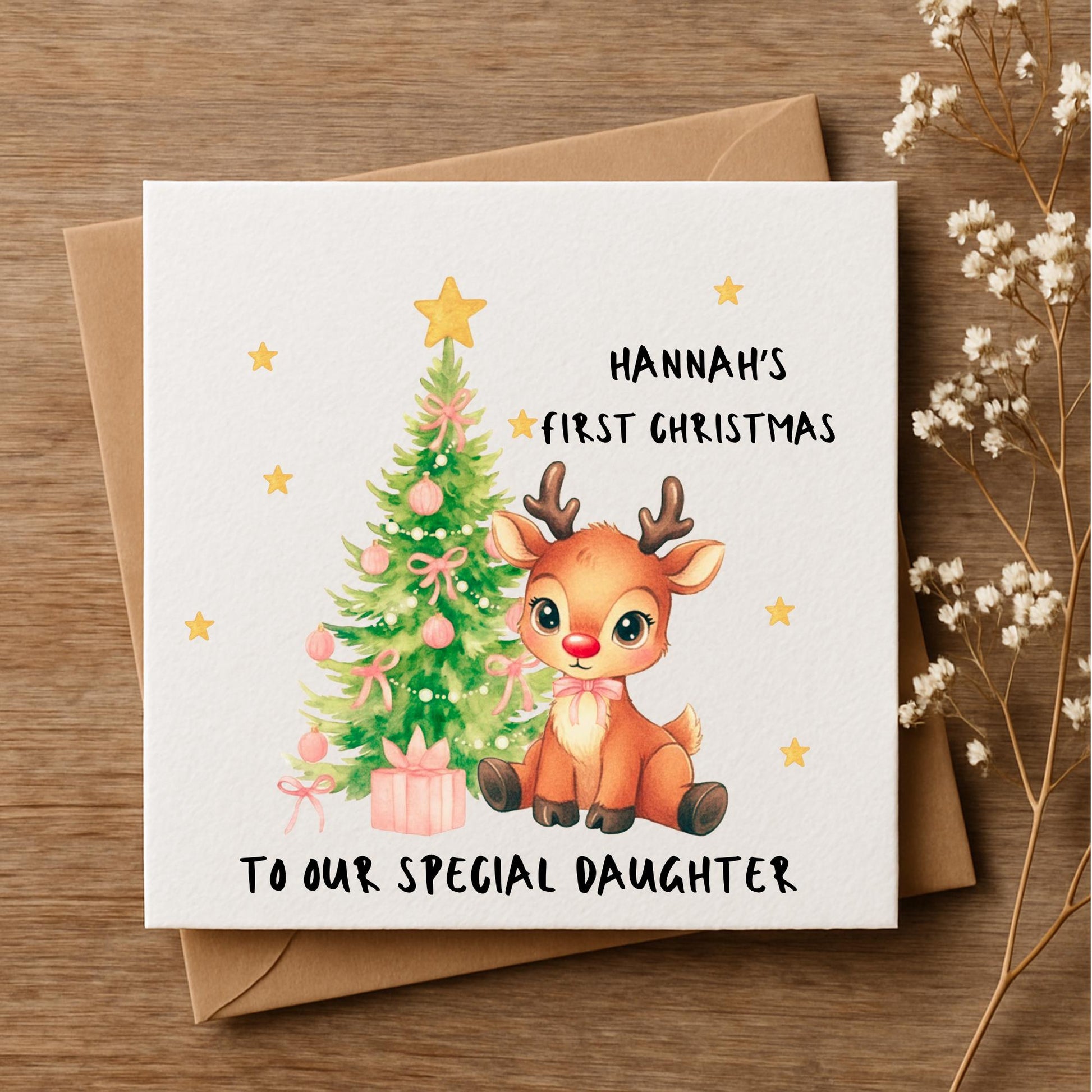 Personalised Reindeer First Christmas Card • Custom Name & Message • Baby’s First Xmas Card • Daughter Son Keepsake • Cute Christmas Card